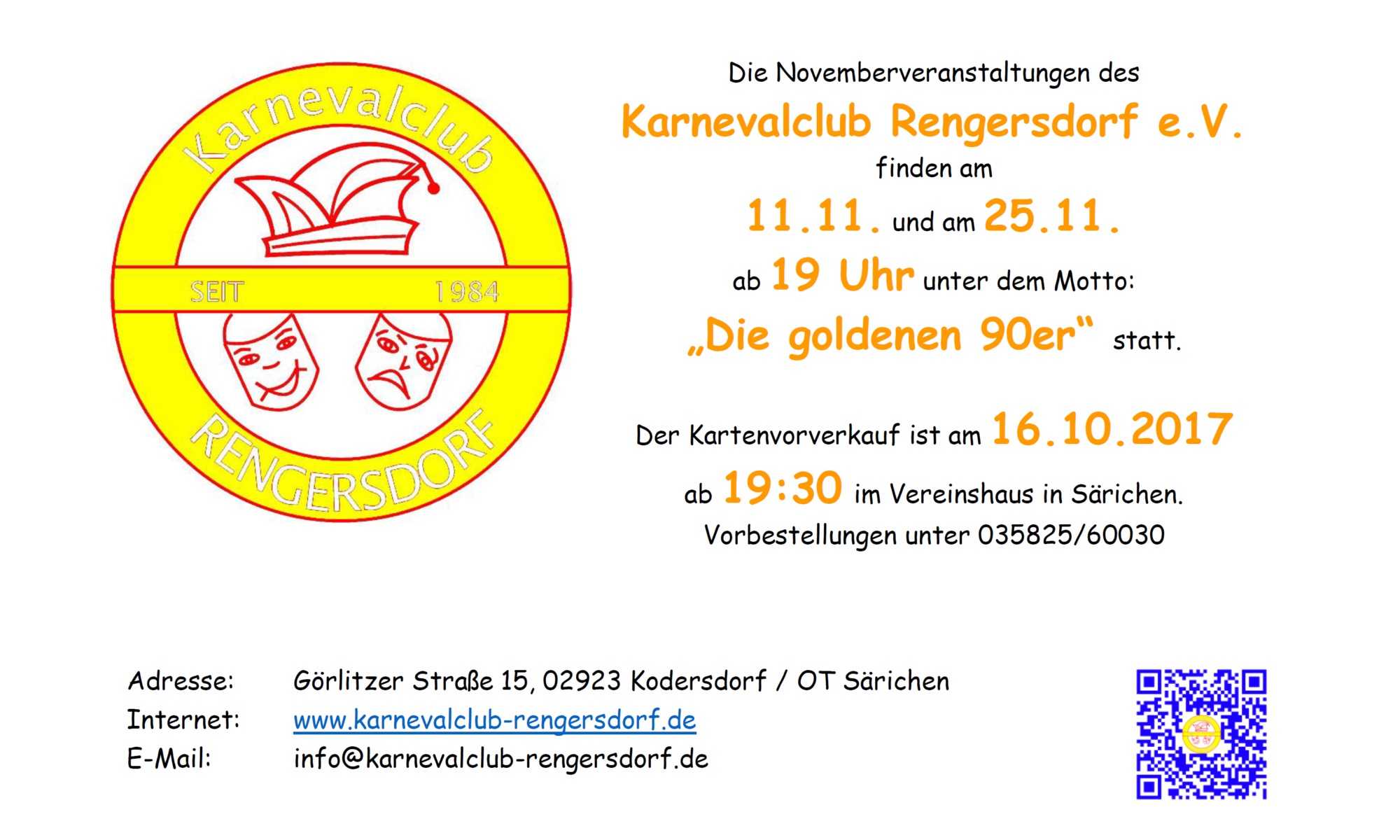 Der Kartenvorverkauf für die Veranstaltungen im November 2017 findet am Montag, den 16.10.2017 im Saal in Särichen statt.
